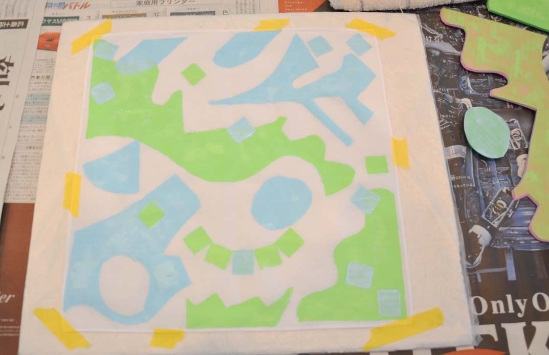 切った厚紙をハンカチの上に置いてみます。順番に切った時にいらなくなった破片も使ってみたりして、配置をよく考えてレイアウトを決めました。どの形を使うか決まれば、その厚紙を鉛筆でスポンジシートに型取りして切り抜きます。(画像4-5)