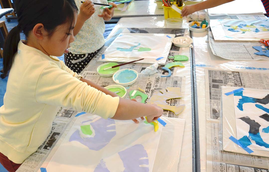 1-10.ワークショップ「オモシロカタチのスタンプハンカチ」の様子