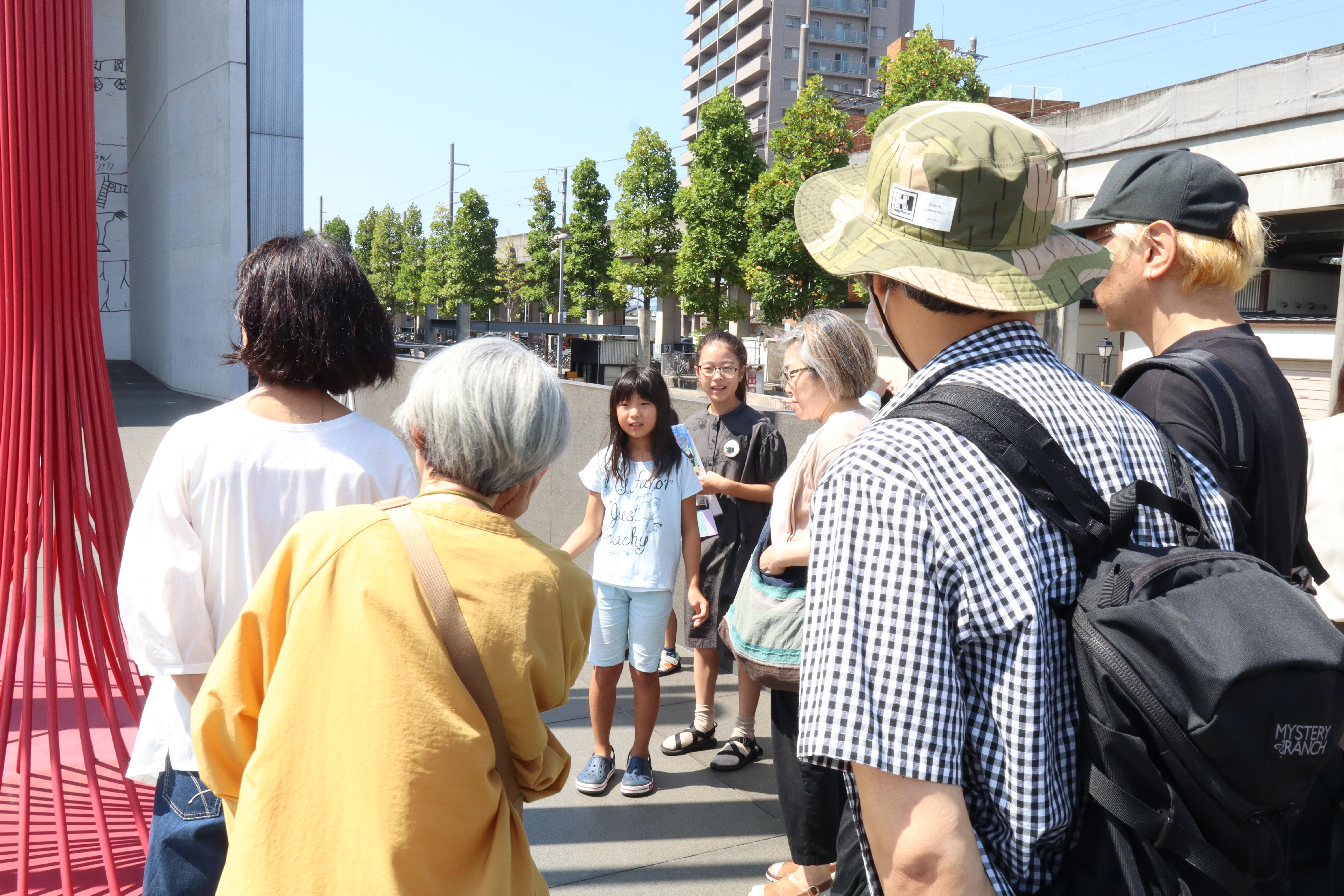 ツアーでは、子どもたちが、MIMOCA\ここ見て!/マップをもとにお客さまをご案内しました。「ゲートプラザにある作品のタイトルは何でしょう?」とクイズを出題したり、「カスケードプラザの黒い壁を触ってみましょう」と声掛けをしたりして、和気あいあいとしたツアーとなりました。